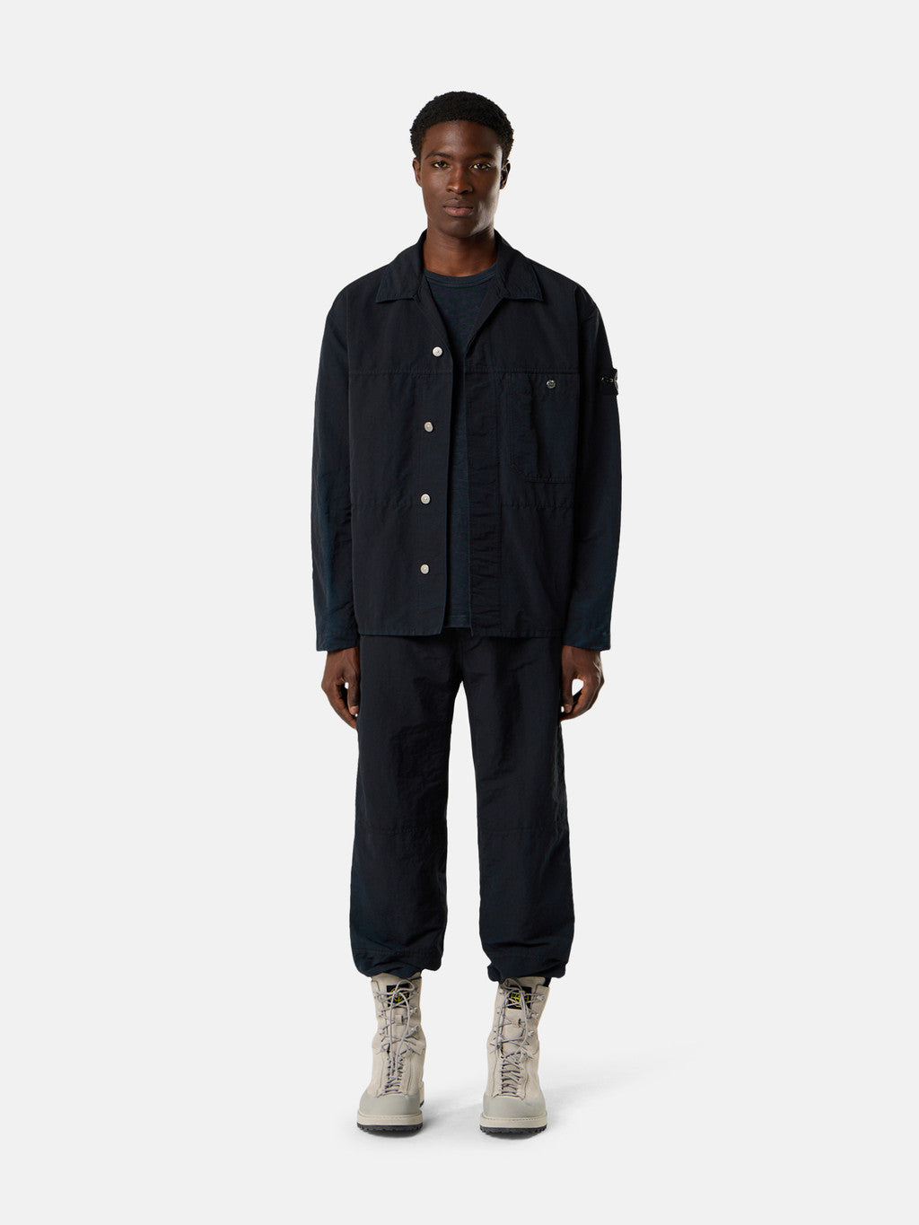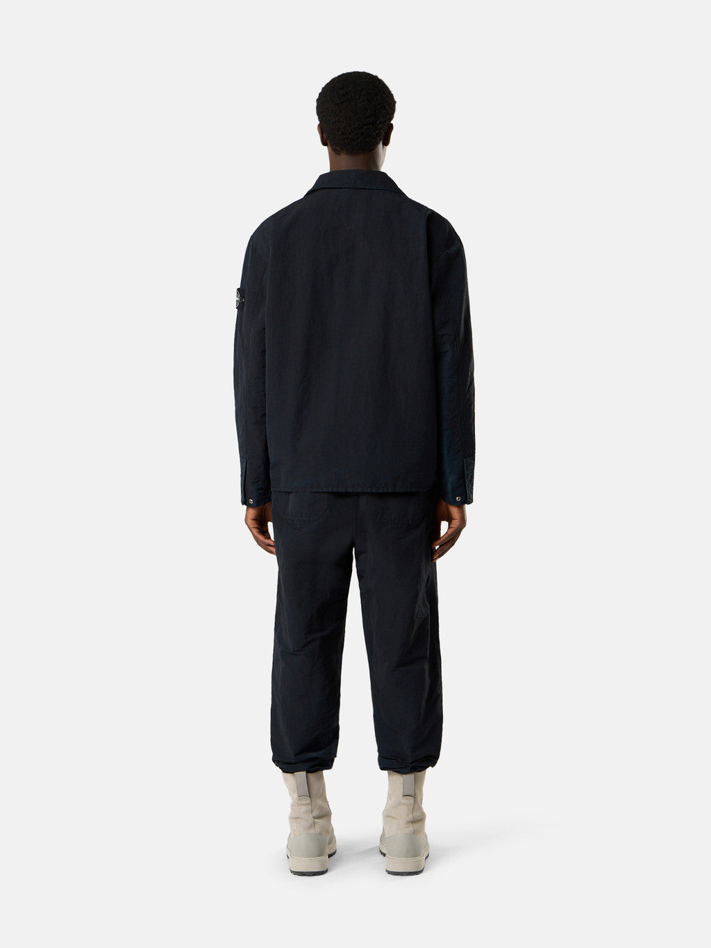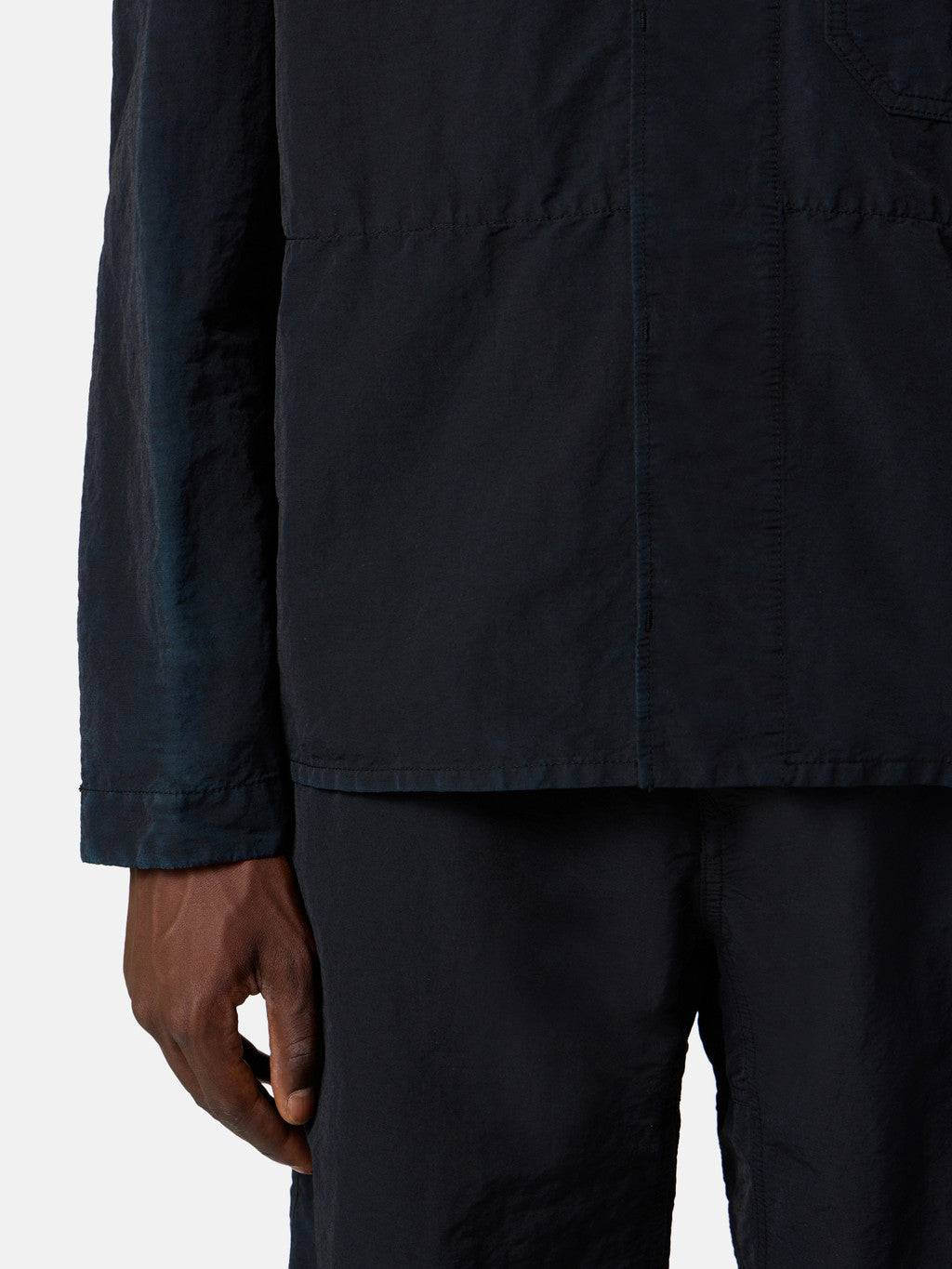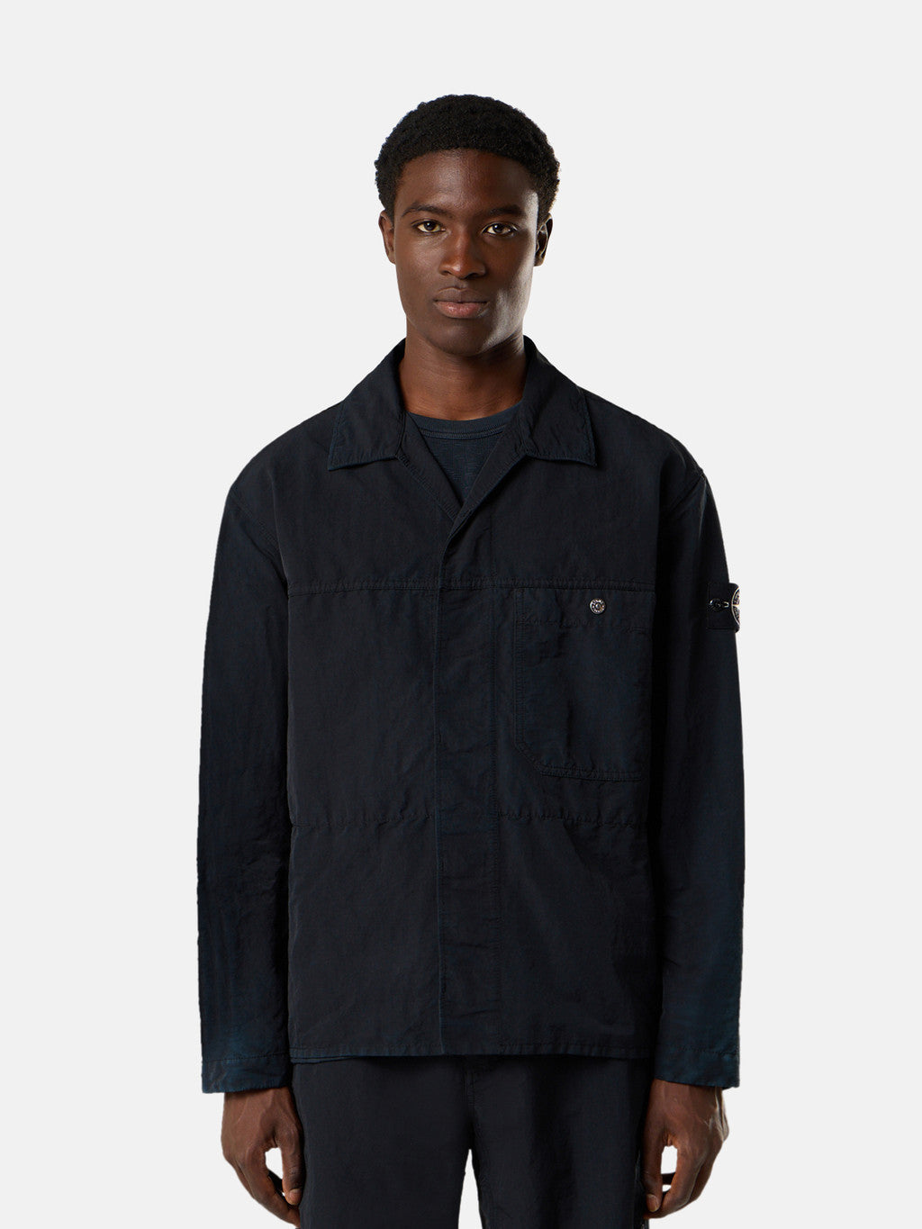 Overshirt made from a fabric composed of mechanically spun recycled nylon fibres that are resistant to wear and abrasion. During the spinning process, the nylon filaments are steamed to achieve a feel closer to organic fibres. Garment dyed with carefully selected dyes, then faded through an innovative corrosion treatment, reflecting Stone Island's ongoing commitment to research and experimentation. The corroded areas, particularly where the fabric is thicker, take on varied colours due to the irregularity of the treatment, creating a slightly worn effect and making each piece unique.