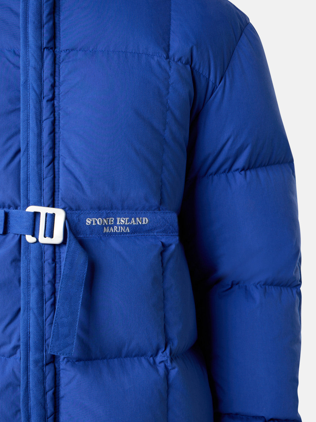 Hooded down jacket in a canvas composed of organic cotton and recycled nylon. The fabric is resin treated on the inside for mild wind and water resistance. Treated with a specific anti-drop agent. Padded with the finest feathers. RDS - Responsible Down Standard certified.