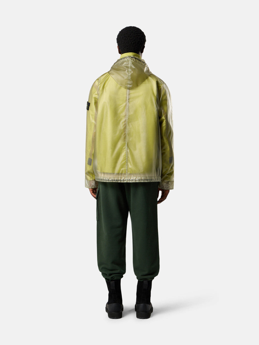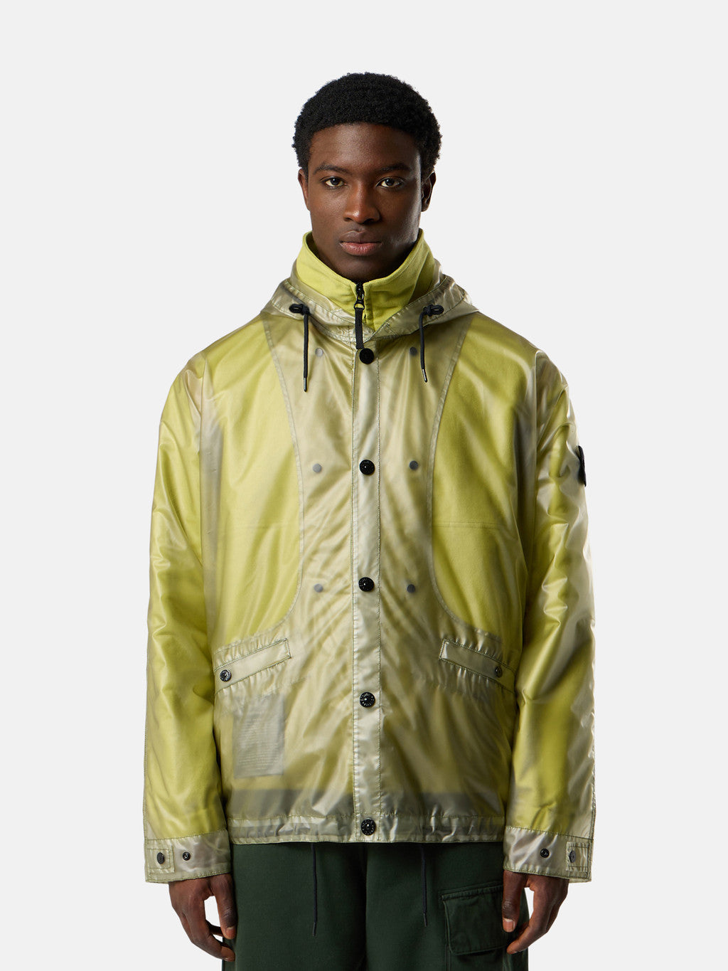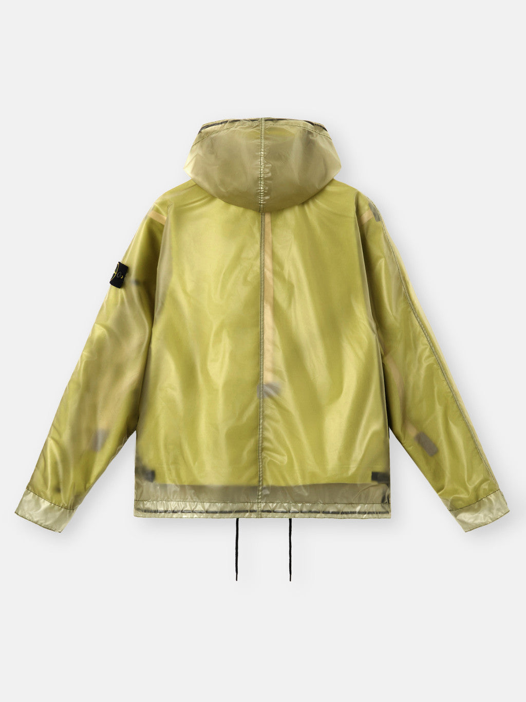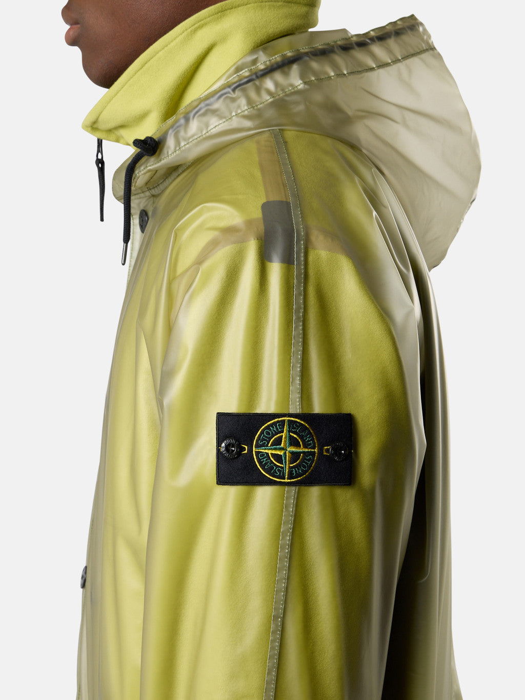 The garment-dyed outer layer of this hooded jacket is made of polyurethane. It is overlaid on a detachable contrast-coloured lining in cotton moleskin. The translucent and semi-transparent exterior opacifies and distorts the colour of the substrate for a dynamic appearance.