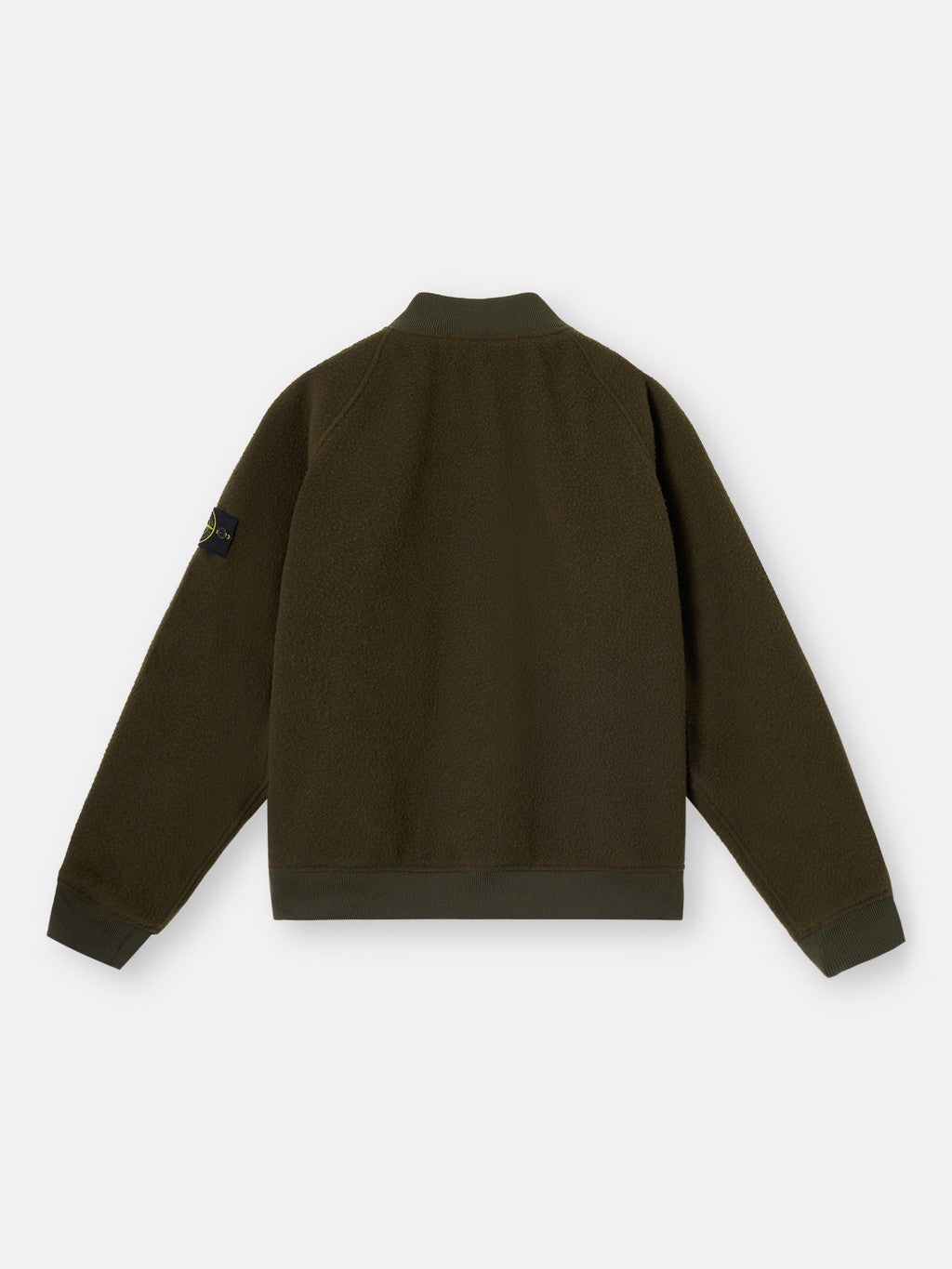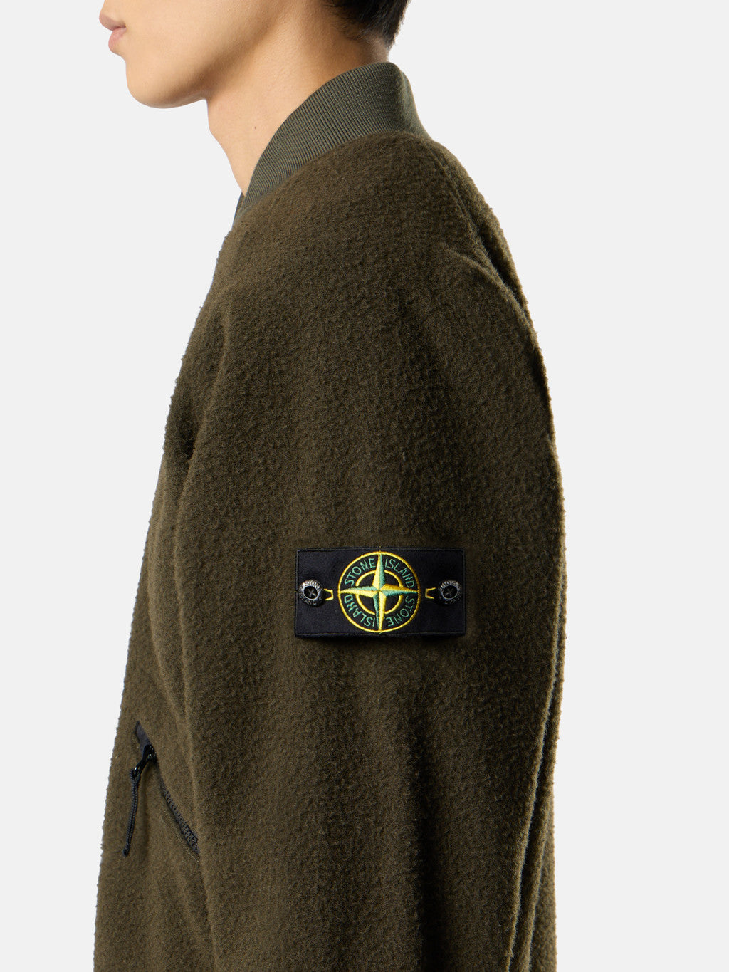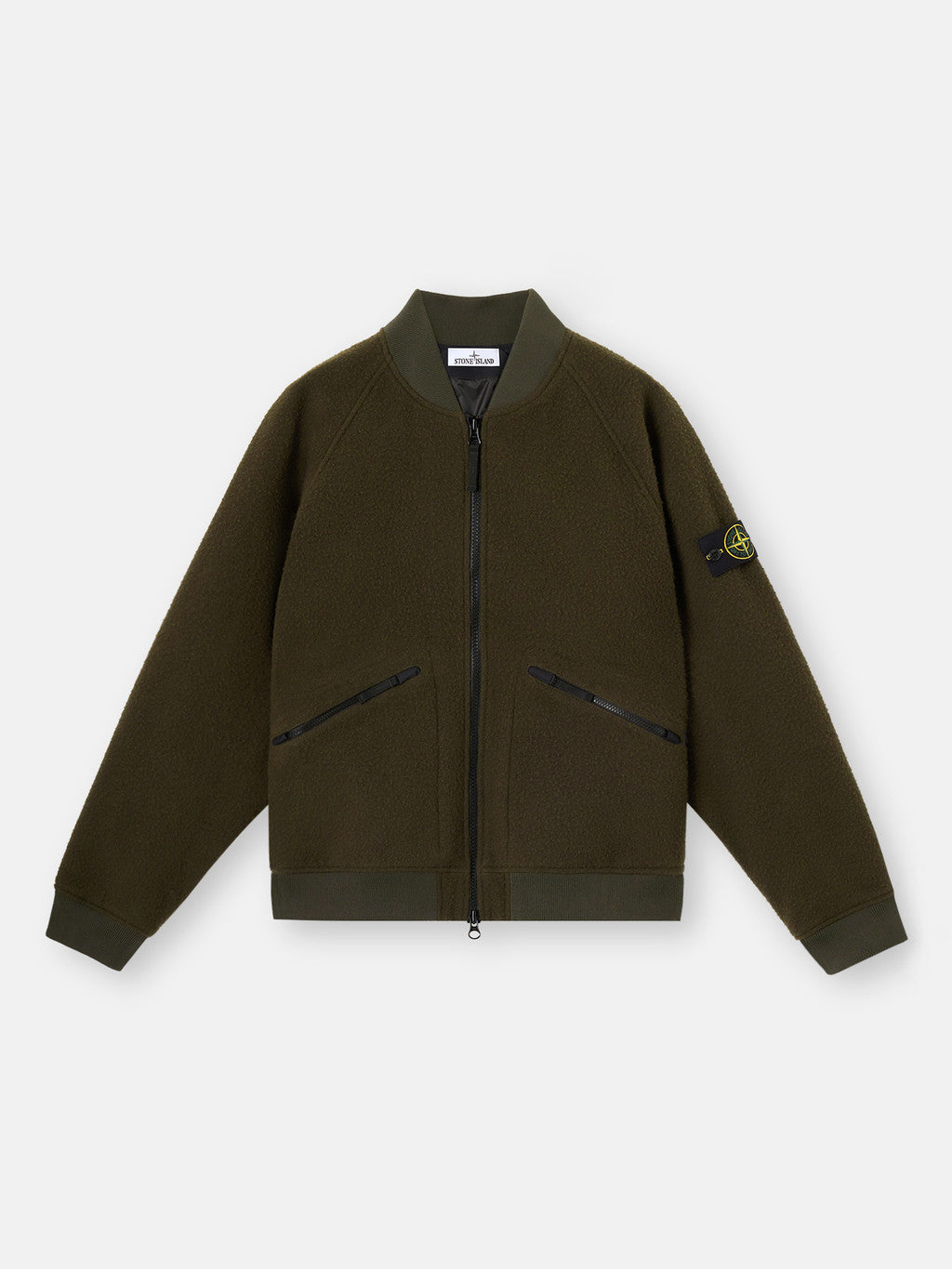 Bomber jacket made of a wool nylon cloth. The ratteen finishing process lends a characteristic knotted appearance to the surface. Treated with a specific anti-drop agent. Nylon ripstop lining.