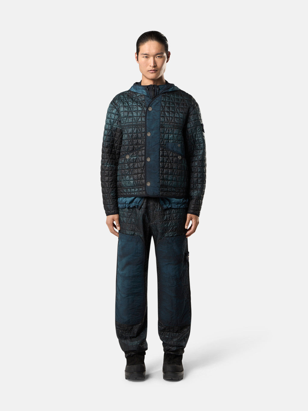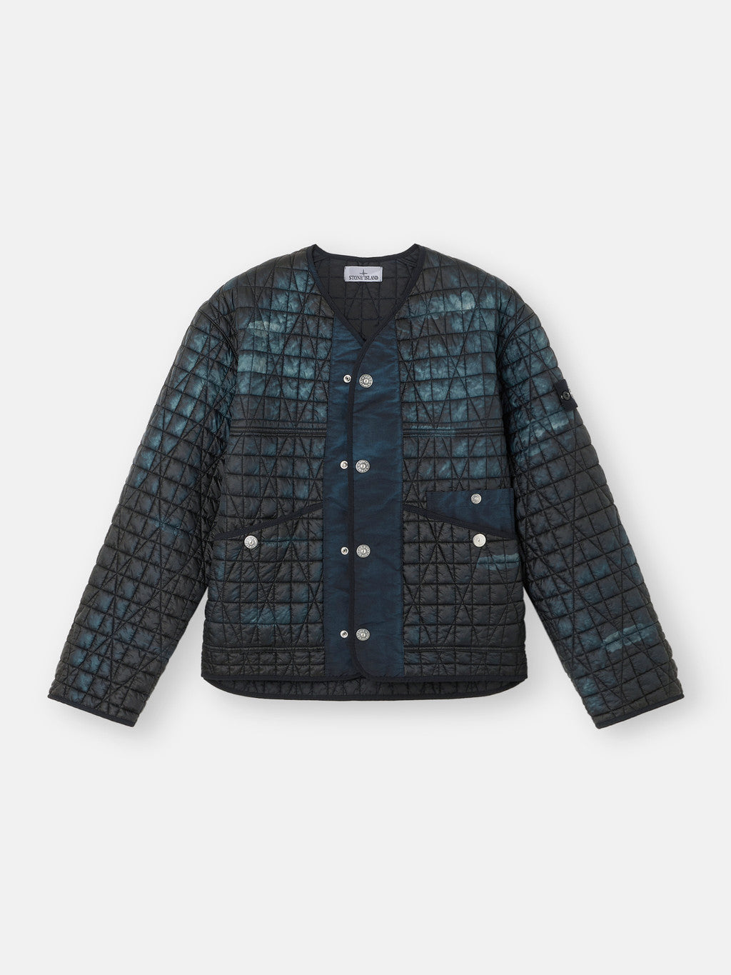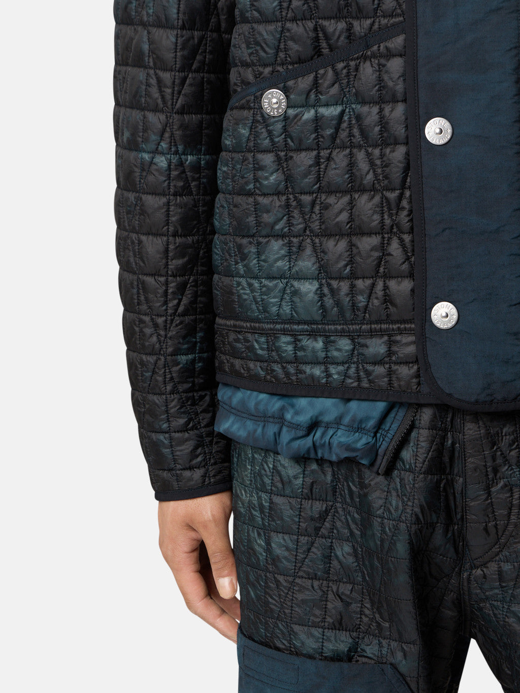 Quilted jacket made from a lightweight, ultra-tightly woven recycled nylon reps, resin-coated on the inside for wind resistance and moderate water resistance and quilted with a multi-axial pattern onto an inner padding layer. Garment dyed with carefully selected dyes, then faded through an innovative corrosion treatment, reflecting Stone Island's ongoing commitment to research and experimentation. The corroded areas take on a worn appearance and varying colours due to the irregularity of the treatment, creating a blurred effect and making each piece unique. Treated with a specific anti-drop agent. Multiaxial quilting padded with PrimaLoft .