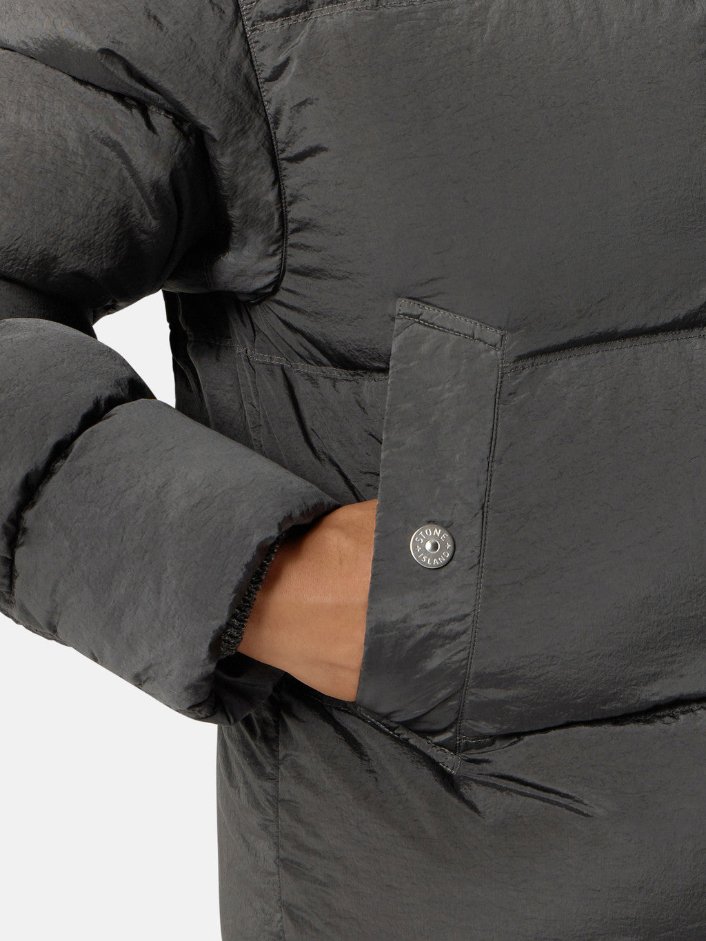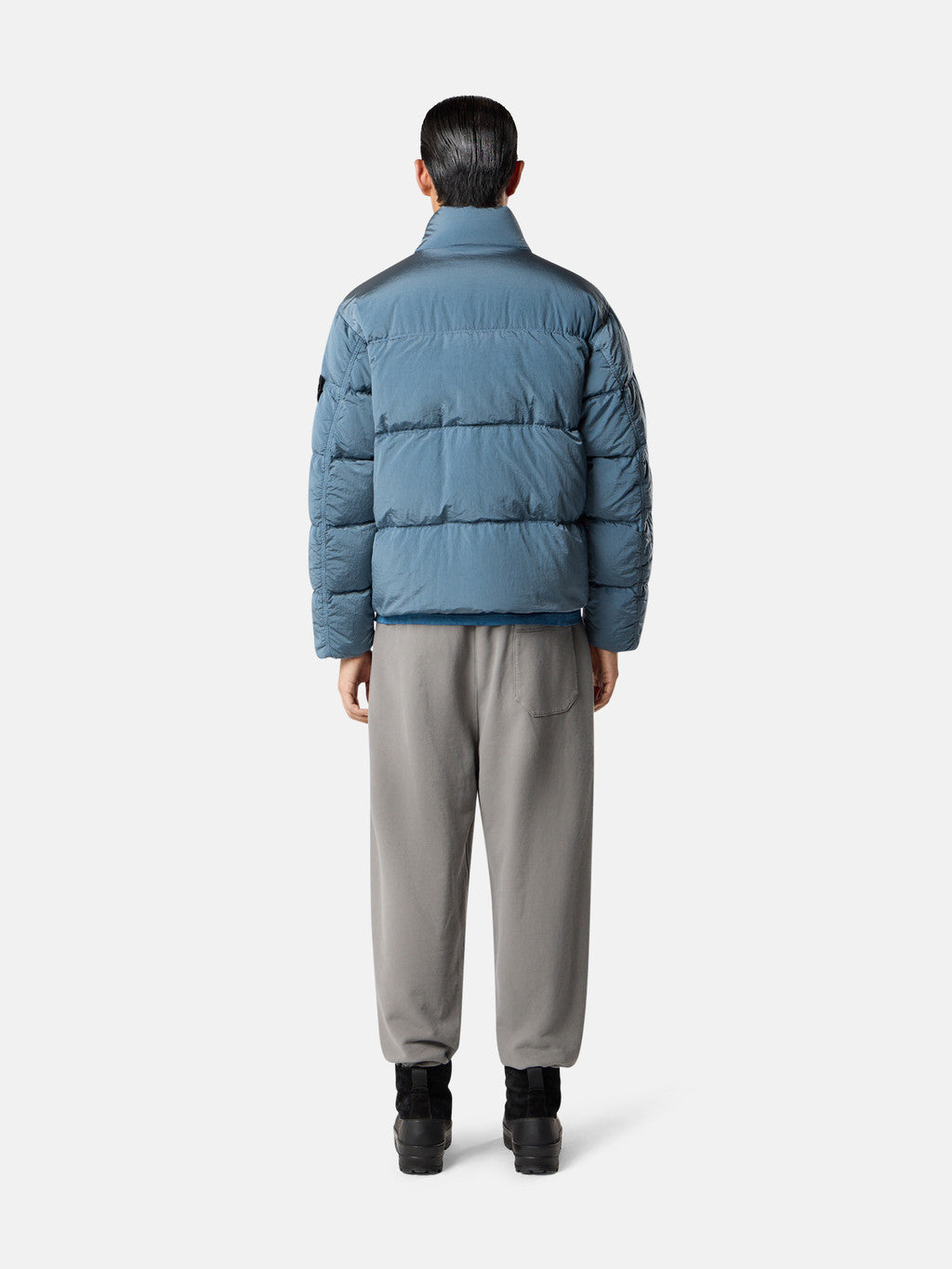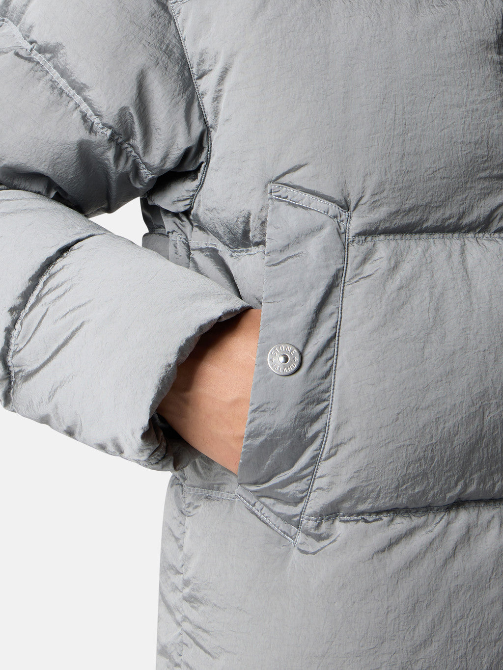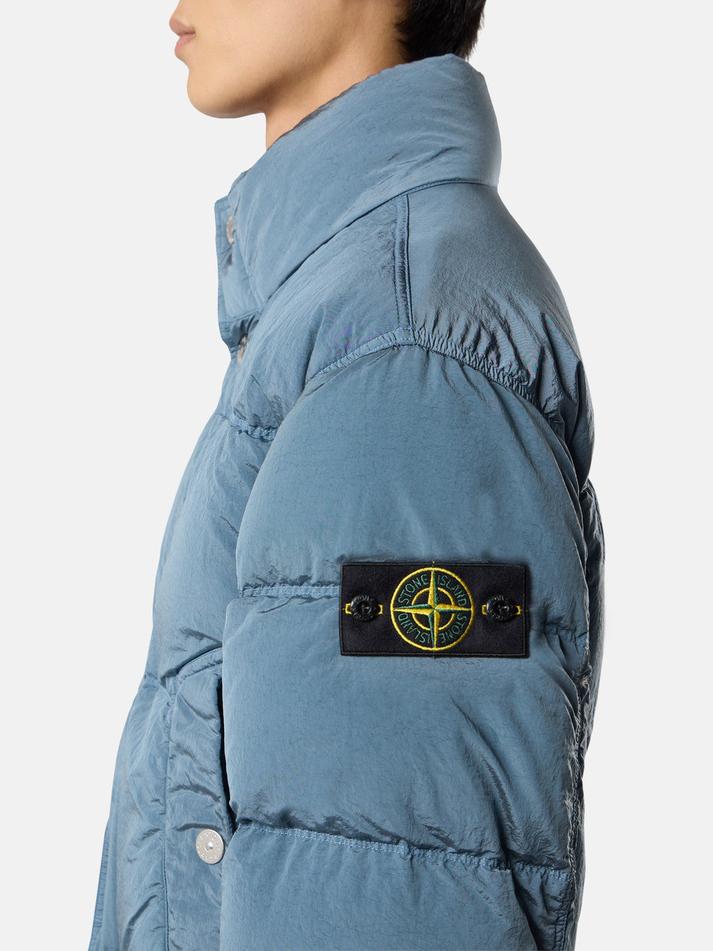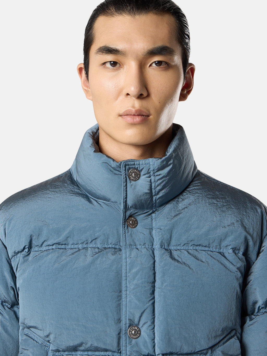 Down jacket in Stone Island's iridescent Nylon Metal fabric. The evolution of this iconic fabric sees the use of ECONYL regenerated yarns: the life ended nylon, pre- and post-consumer, is recycled with a complex depolymerization process to create this fibre that features the same intrinsic characteristics of nylon from fossil raw material. Garment dyed with a double colour recipe and the addition of a special anti-drop agent. Padded with the finest feathers specifically treated to withstand the garment dyeing procedure. RDS - Responsible Down Standard certified.