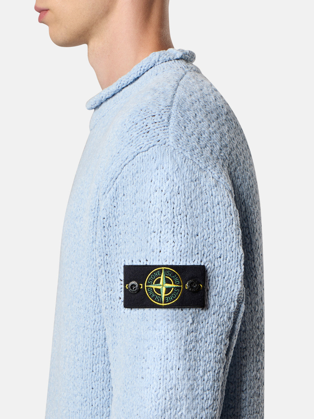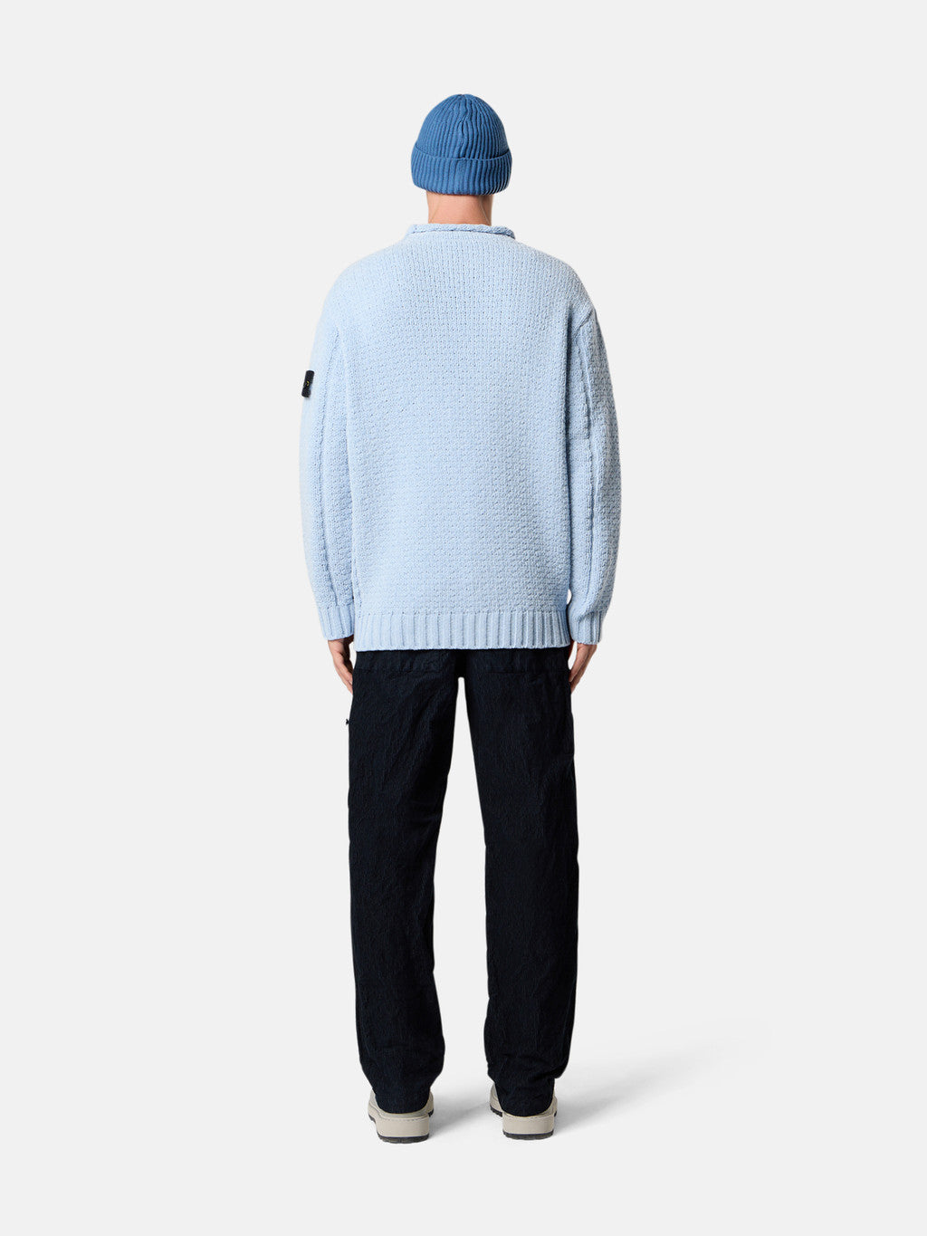 Knit mock neck jumper in cotton chenille. Reverse bobble stitch. Gauge 3.