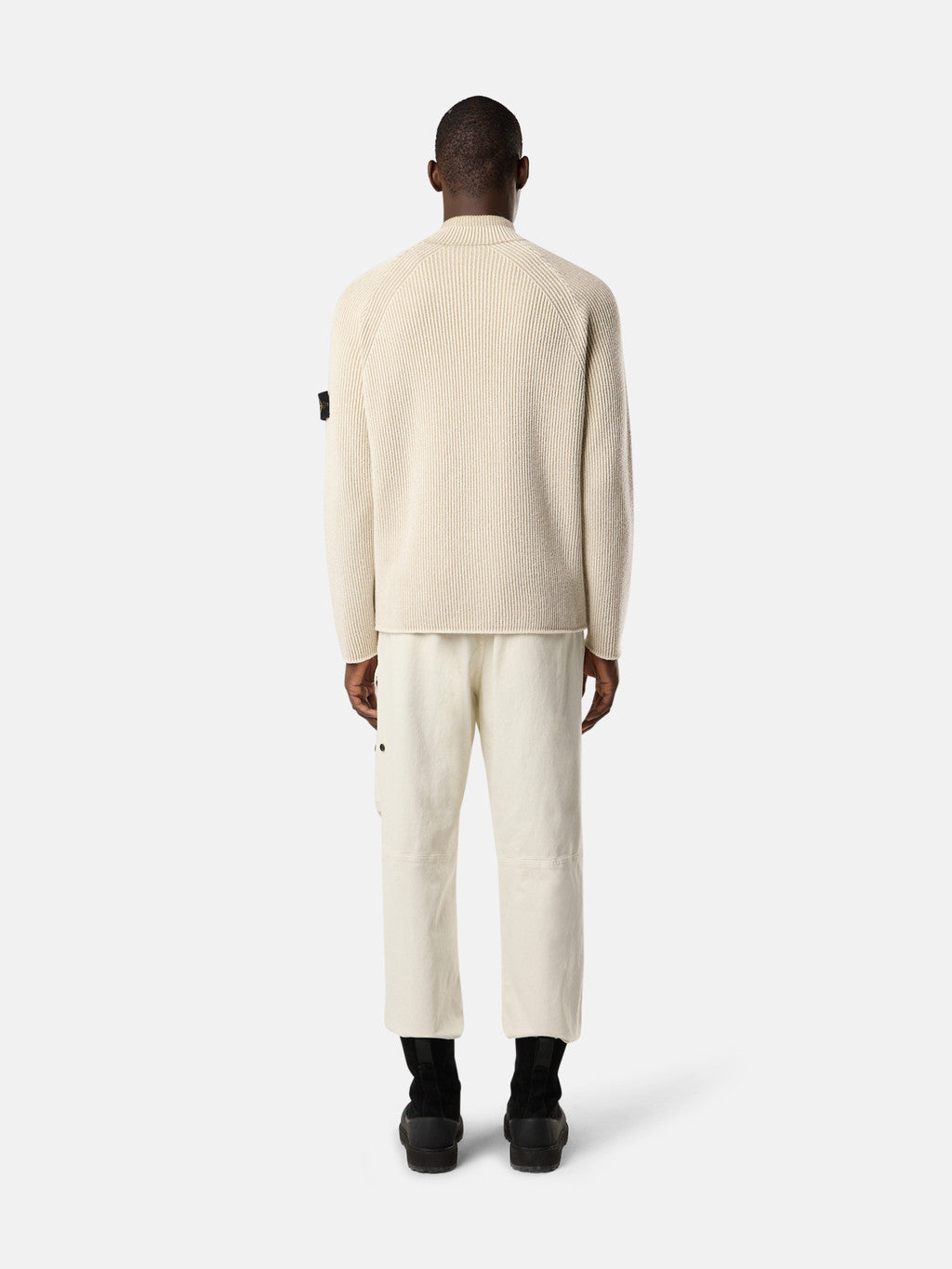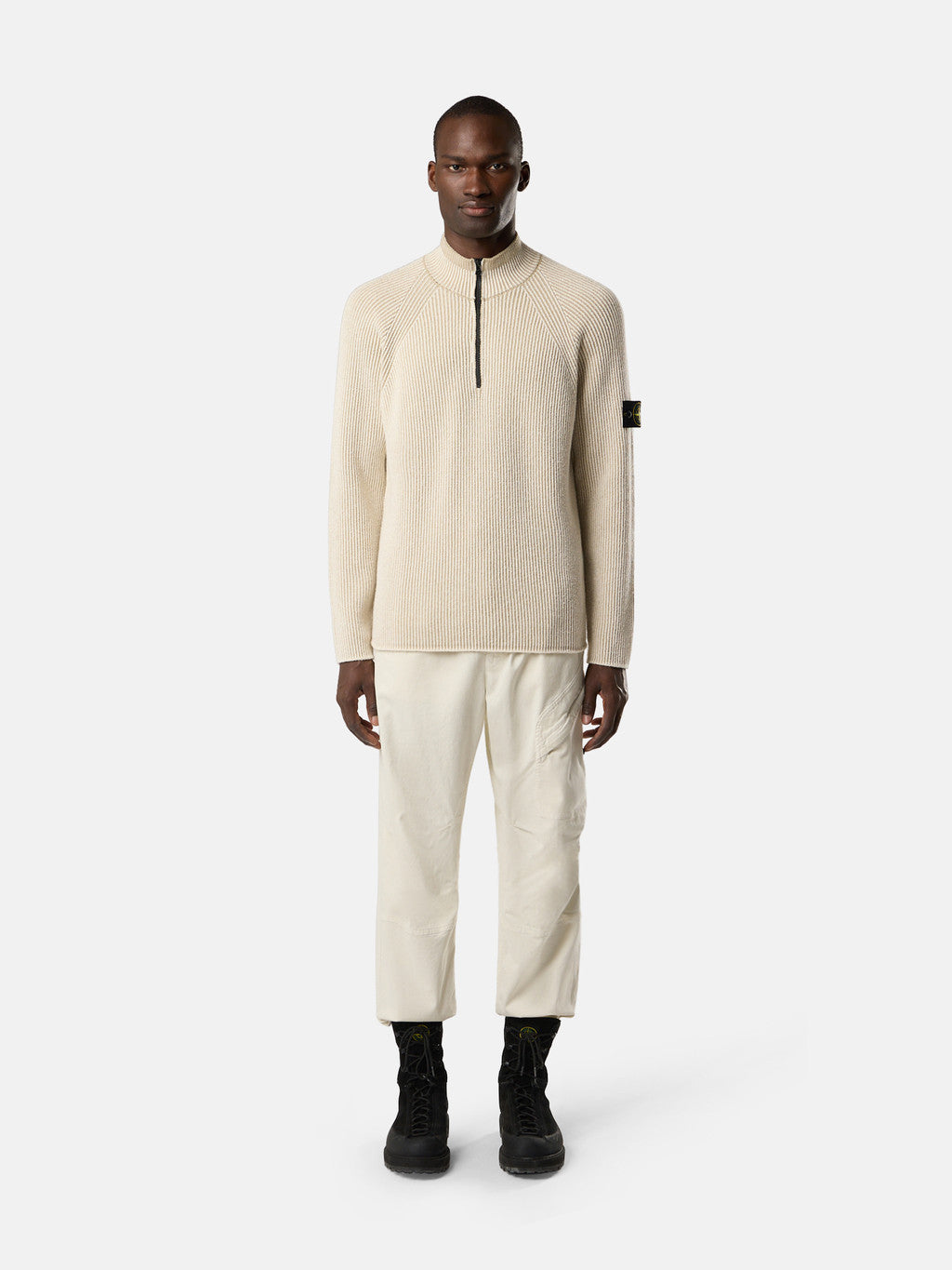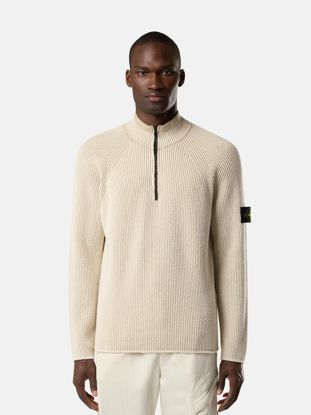 Knit half-zip jumper with full ribbing in RWS certified wool with two different coloured yarns, worked with the vanise technique to obtain a deeper perception of the rib and contrasting colour placements. Gauge 7. The Responsible Wool Standard (RWS) describes and certifies animal welfare and land management practices in wool production and tracks the certified material from farm to final product.