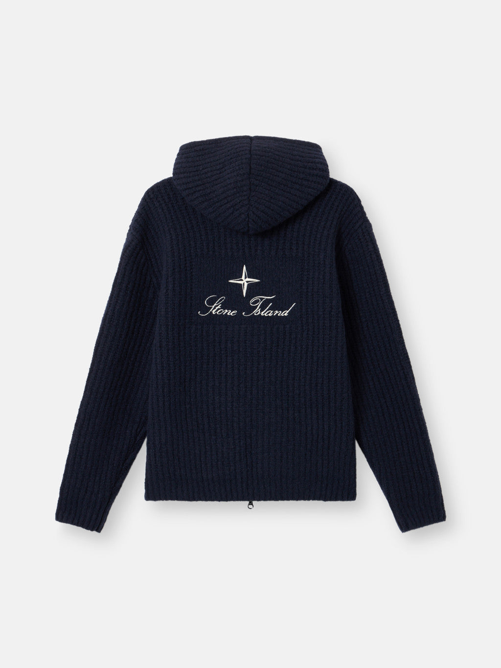 Knit hooded zip-up jumper in wool nylon boucl¨¦. Fisherman's rib. Gauge 3.