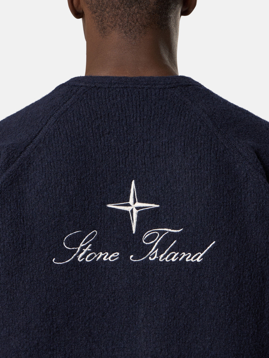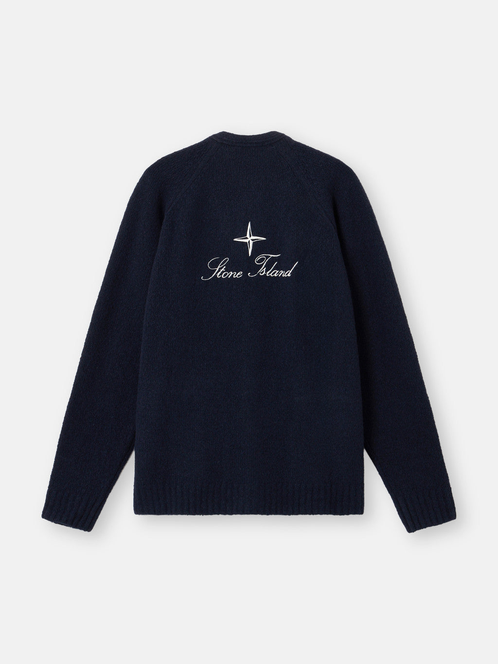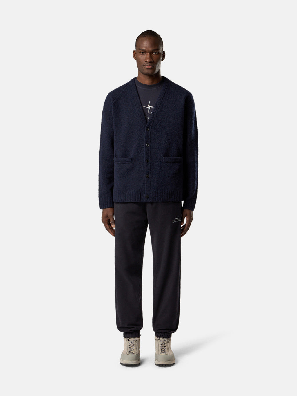 Knit V-neck cardigan in wool nylon boucle. Stocking stitch. Gauge 5.