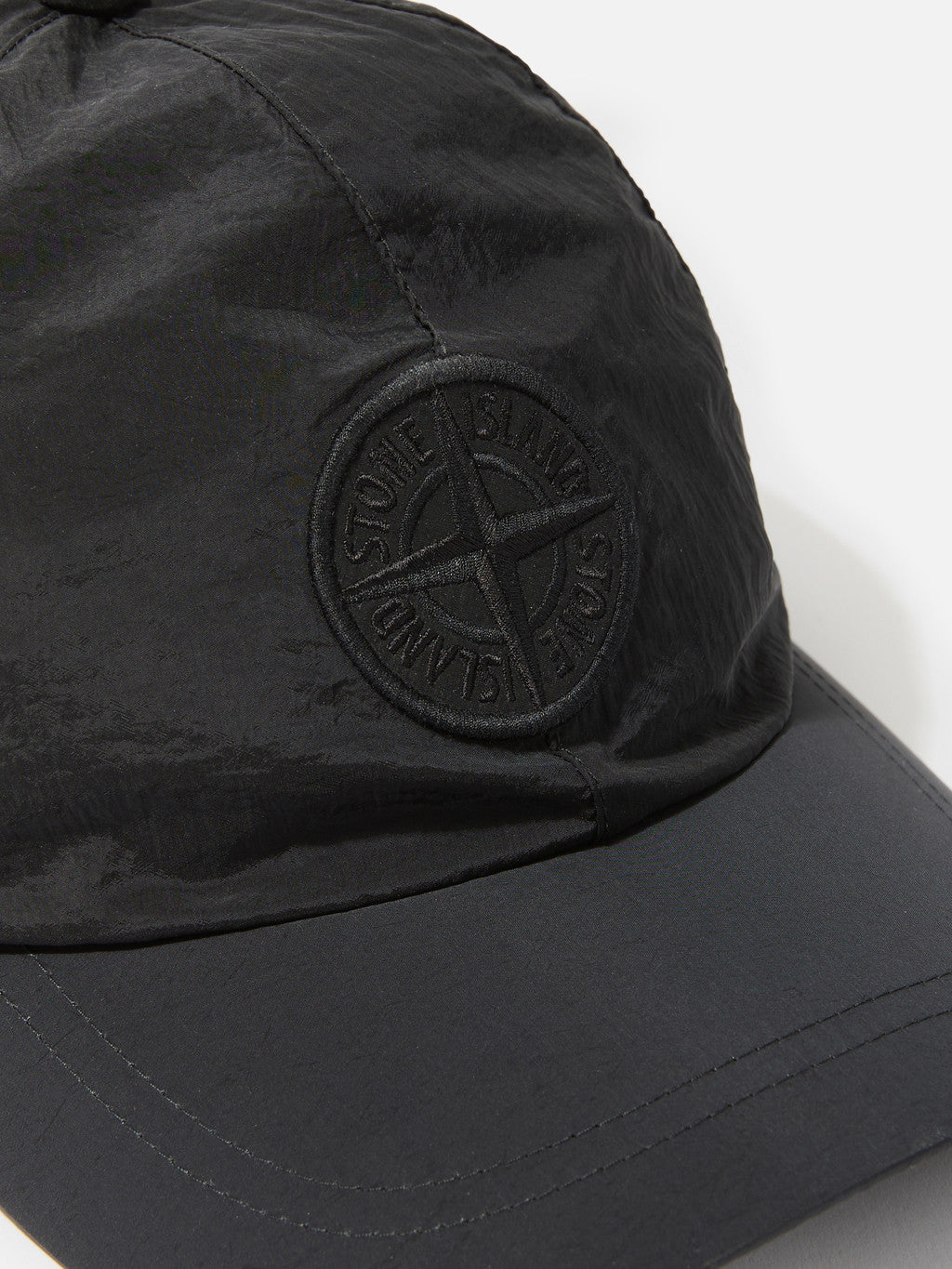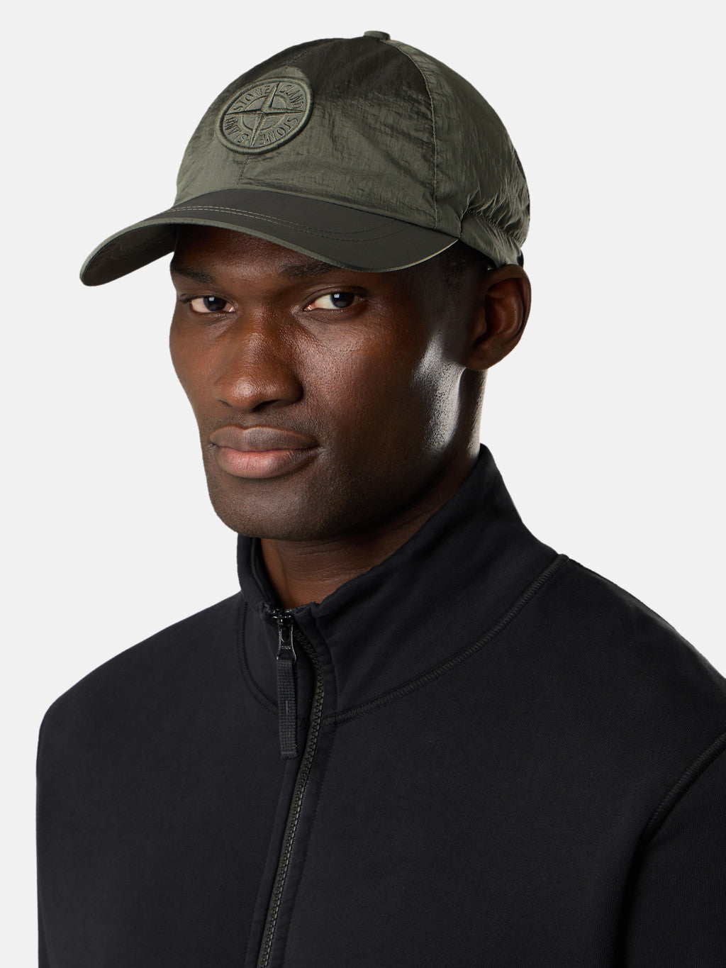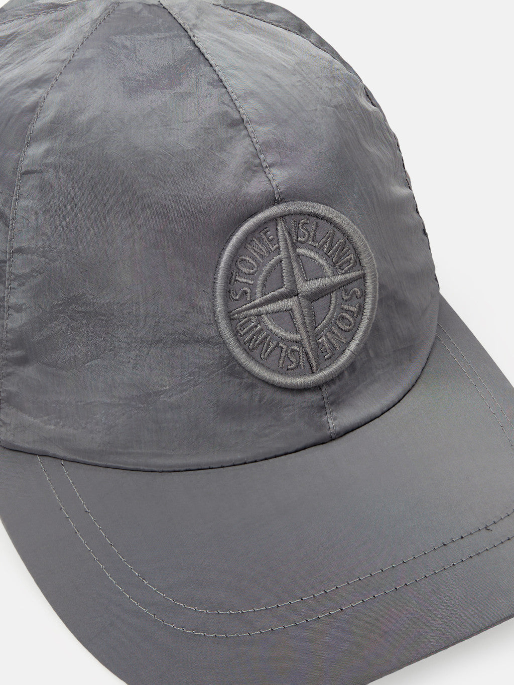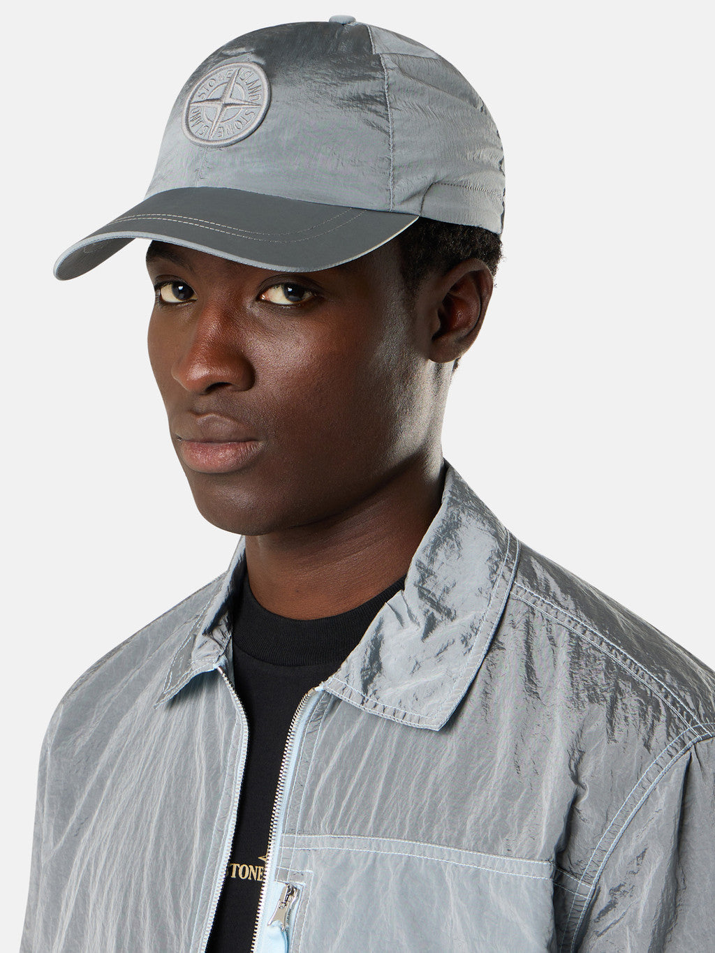 Baseball cap in Stone Island's iridescent Nylon Metal fabric. The evolution of this iconic fabric sees the use of ECONYL regenerated yarns: the life ended nylon, pre- and post-consumer, is recycled with a complex depolymerization process to create this fibre that features the same intrinsic characteristics of nylon from fossil raw material.