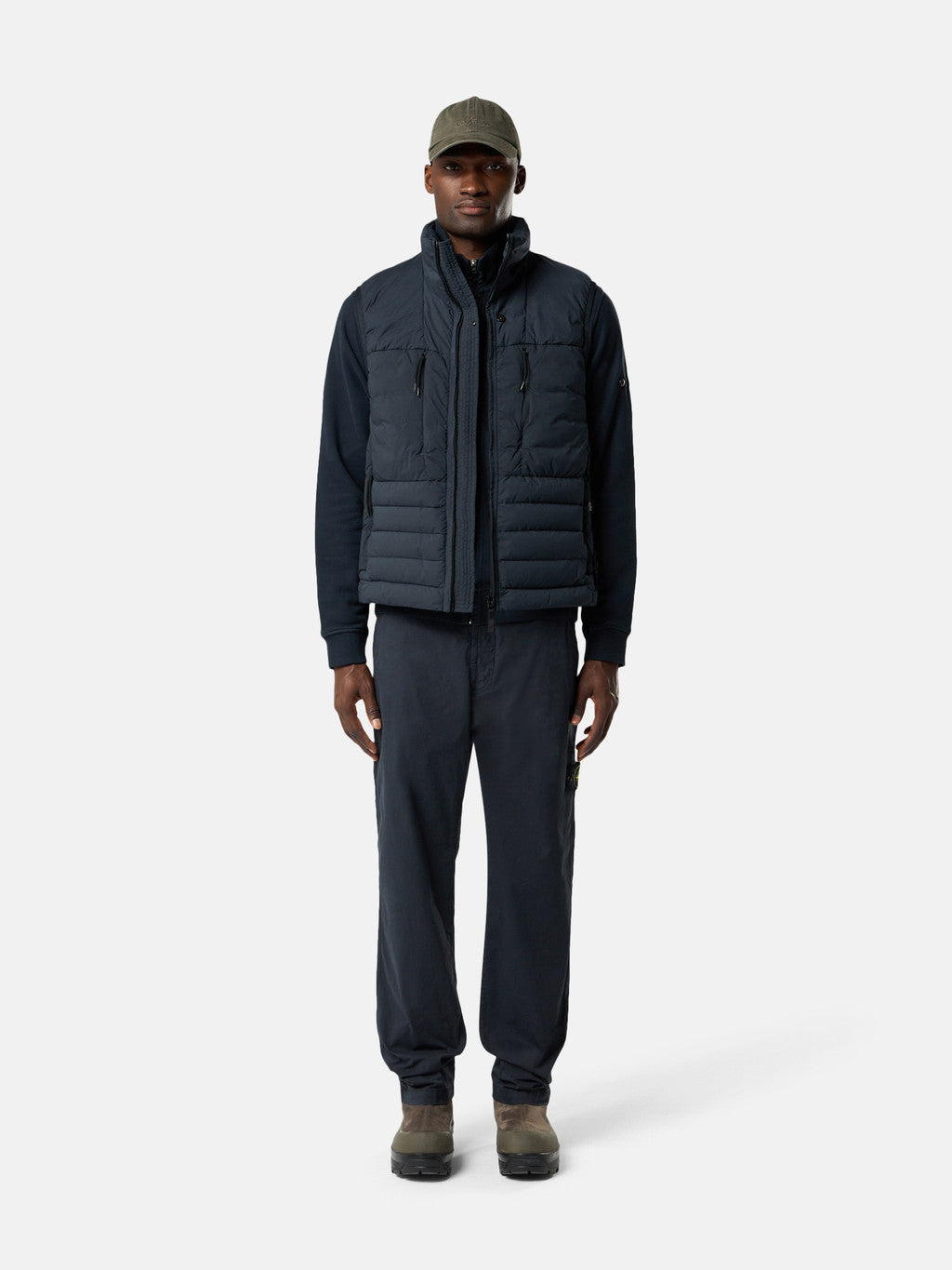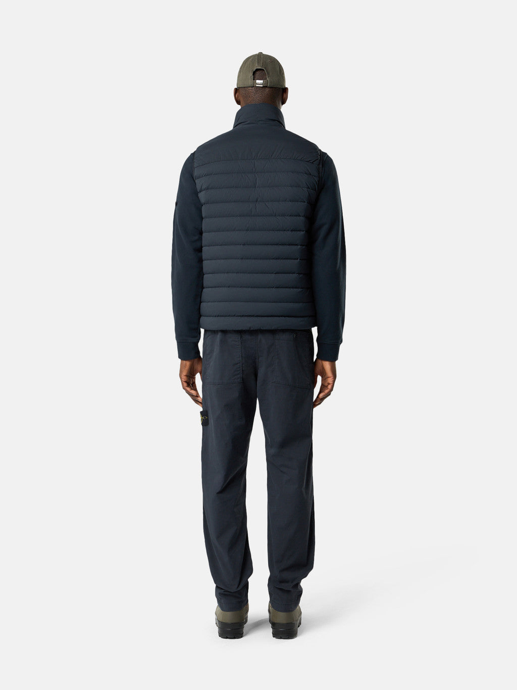 Down vest in a light stretch nylon single layer fabric undergoing a special weaving technique automatically creating the feather compartments directly from the loom. The seamless feather tunnels substantially increase the hold of the down. The finished garment is padded with direct injection with the finest feathers, specifically treated to resist garment dyeing. Garment dyed with the addition of a special anti-drop agent. RDS - Responsible Down Standard certified.