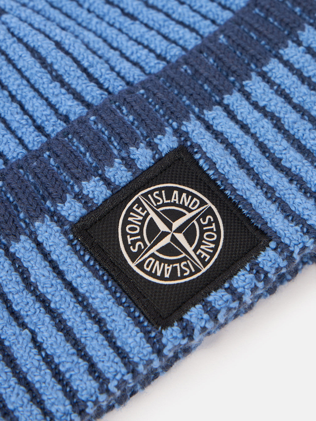Knit beanie with full ribbing, in RWS certified wool with two different coloured yarns, worked with the vanise technique to obtain a deeper perception of the rib and contrasting colour placements. Gauge 7. The Responsible Wool Standard (RWS) describes and certifies animal welfare and land management practices in wool production and tracks the certified material from farm to final product.