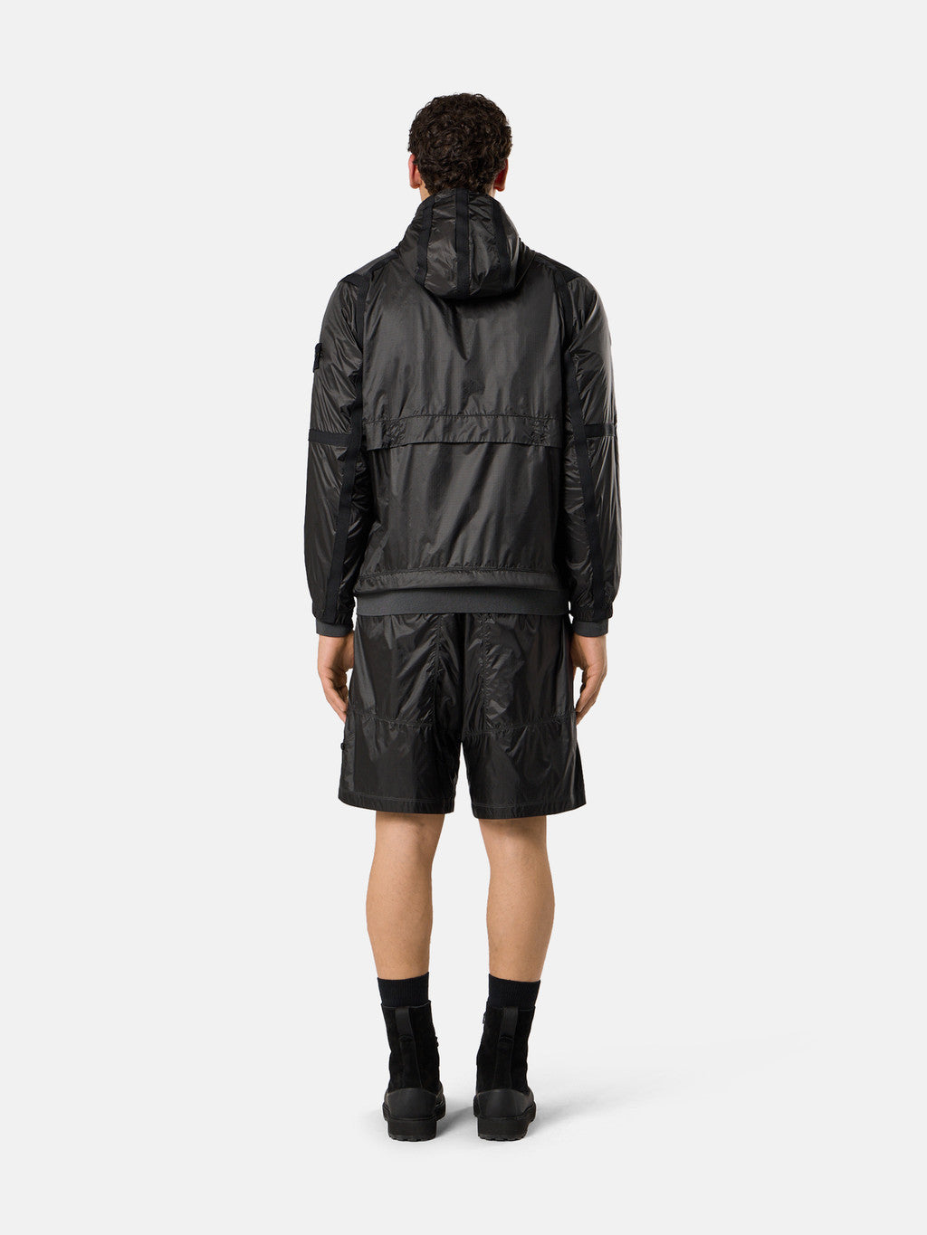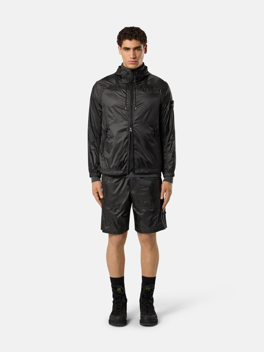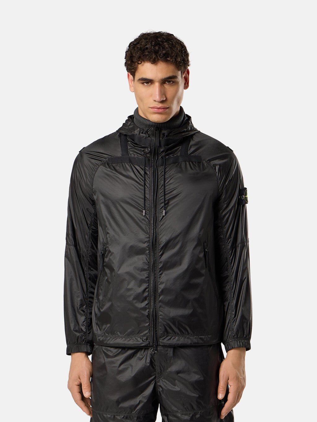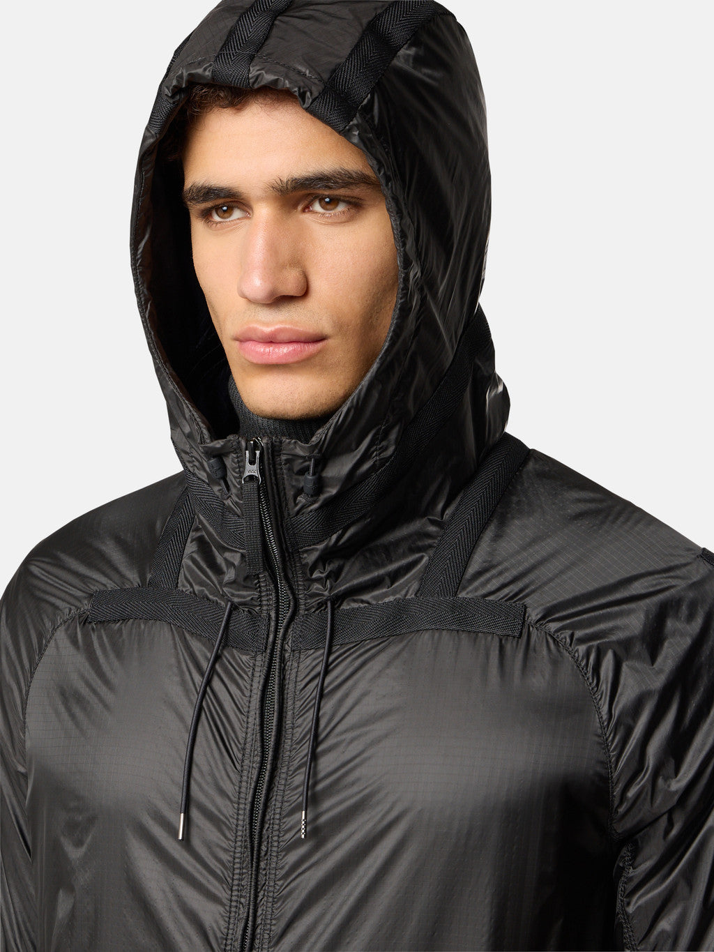 Light hooded jacket in a high-tenacity ripstop nylon 6.6 that is lightweight yet extremely durable. The semi-transparent fabric is double layered on some parts of the garment, highlighting its geometry. Treated with a specific anti-drop agent.