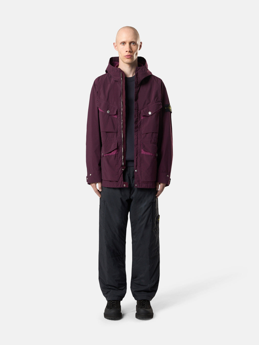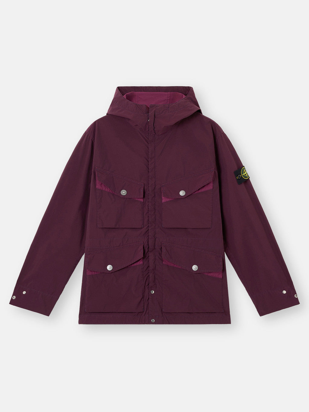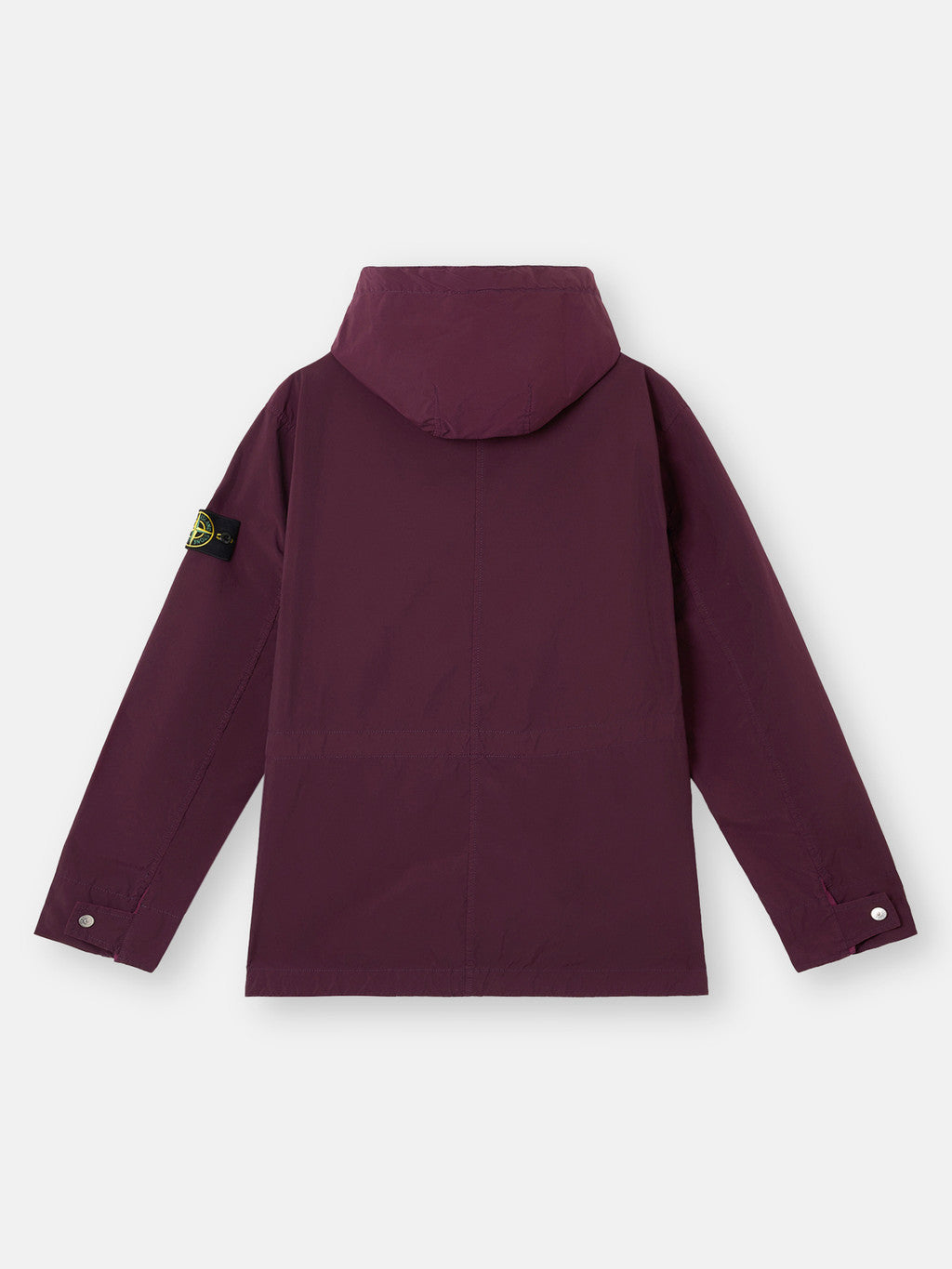 Hooded field jacket made from a lightweight canvas with 60% recycled polyester, featuring a super matt appearance and a cotton-like hand. The fabric compacts and takes on its final appearance through the garment dyeing procedure at 130¡ã under pressure. The addition of a special agent to the dye recipe makes the garment anti-drop.