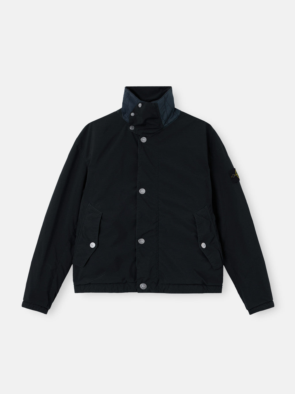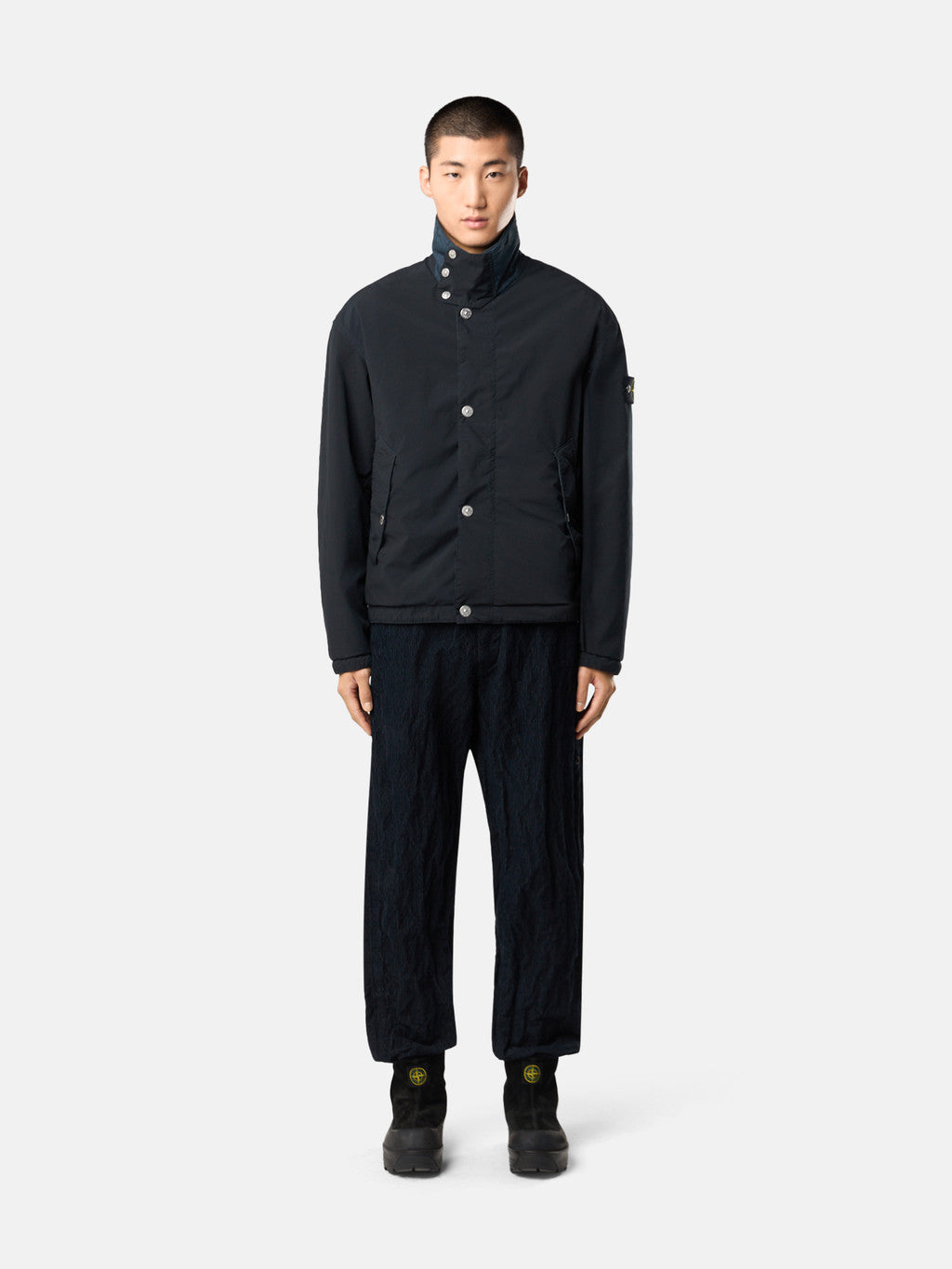 Coach jacket made from a lightweight canvas with 60% recycled polyester, featuring a super matt appearance and a cotton-like hand. The fabric compacts and takes on its final appearance through the garment dyeing procedure at 130¡ã under pressure. The addition of a special agent to the dye recipe makes the garment anti-drop.